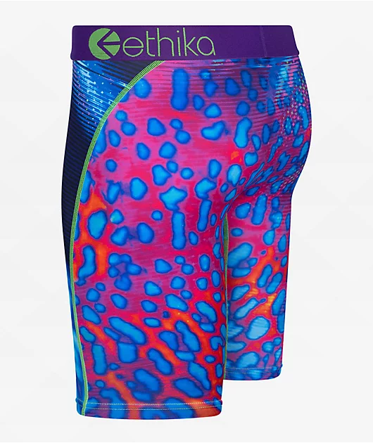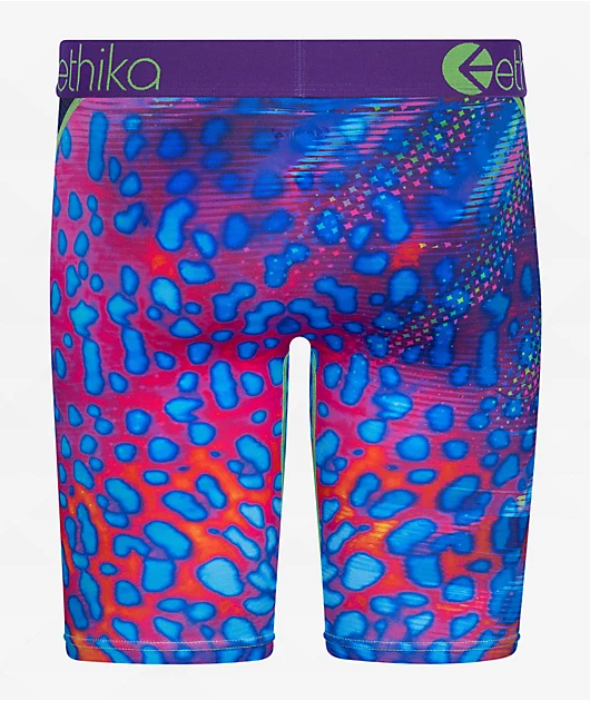 The Flow Fanz boxer briefs from Ethika Underwear comes in a vibrant purple and green colorway, and features a sublimated graphic of a cheetah cat. The briefs are constructed from a breathable and stretchy blend of polyester and spandex, and the flatlock-s