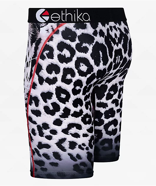Ethika Fyre Katt Boxer Briefs The Ethika Fyre Katt boxer briefs boast a sublimated graphic of a white snow leopard with red eyes at the center. The poly-spandex blend offers superior mobility and breathability, while the flatlock-stitched seams prevent it
