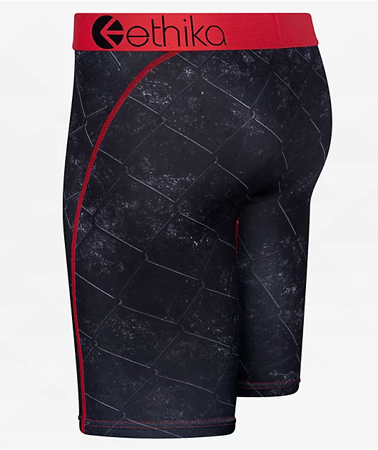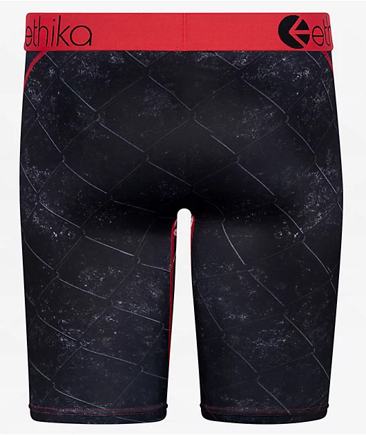The Get At Me boxer briefs from Ethika come in a black and red colorway, with a sublimated imagery of a barking rottweiler and chain link fencing. Made from a stretchy and breathable poly-spandex blend, the boxers are finished with flatlock stitched seams
