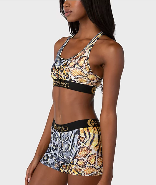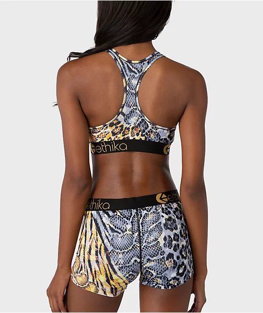 The Golden Twist sports bra from Ethika comes in a racerback silhouette straps with a thick, elastic underbust band providing plenty of coverage and support, while sporting a variety of animal-inspired prints throughout.