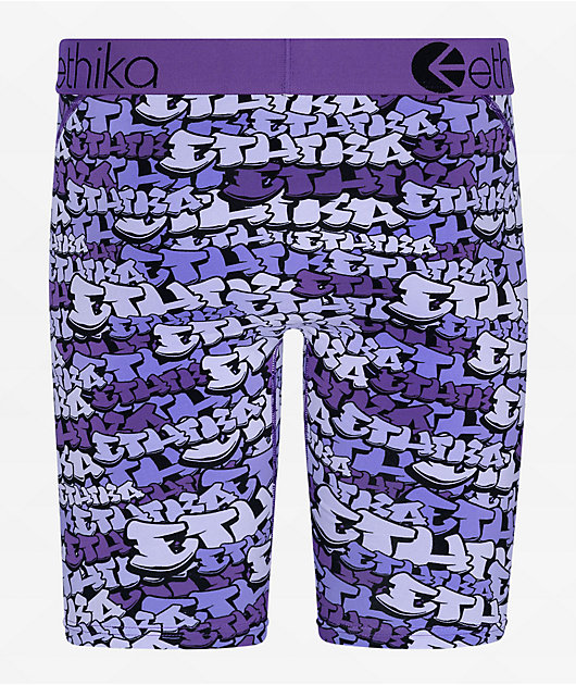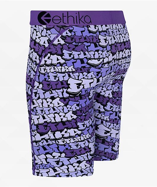 The Graffiti Pattern boxer briefs from Ethika Underwear feature sublimated logo script throughout in purple graffiti font. The briefs feature no-rise technology keeping the boxers in place, while the cozy blend of polyester and spandex offers superior bre
