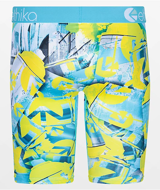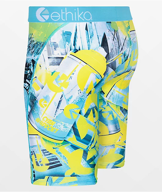 The In Tha Yard boxer briefs from Ethika show off colorful images of graffiti and spray-paint cans throughout for a wild style. This athletic underwear is made from a durable and stretchy polly-spandex blend, offering a snug fit with a thick elastic waist