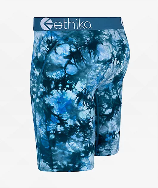 The kids Acid Sky boxer briefs from Ethika feature a blue tie dye colorway throughout, adorned with white brand script sublimated across the elastic waistband for bold branding.