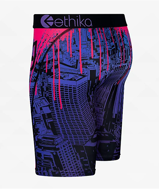 The kids BMR Drip City boxer briefs from Ethika feature flatlock-stitched seams for an itch-free fit. The briefs are decorated with a graphic of a city landscape, and red paint dripping from the waistband, as well as red dollar signs throughout.