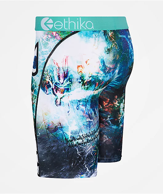 From Ethika comes the Bomber 24 Hours boxer briefs in kids sizing, featuring a thick tiffany blue non-itch waistband with jacquard knit Ethika branding on the front. With a sublimated galaxy print and Ethika’s bomber shark design on the left leg, the stre