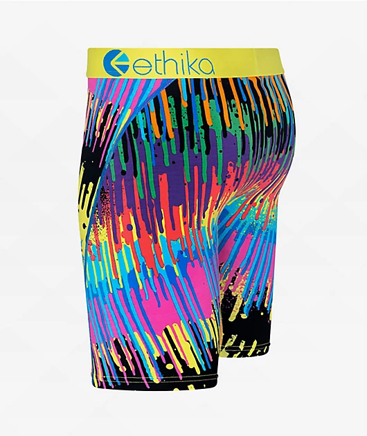 The kids Dripped Out boxer briefs from Ethika come in a yellow colorway, showing off a colorful drip design throughout. These athletic briefs offer a breathable construction and flatlock-stitched seams for easy all-day wear, coming complete with a thick e