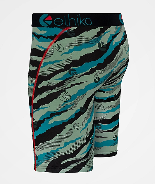 The Kids Game Hunter Boxer Briefs from Ethika feature a sublimated turquoise, black, and green camouflage pattern with Ethika logo branding throughout. The polyester blend fabrication of these Ethika boxer briefs are form fitting, and red accents can be s