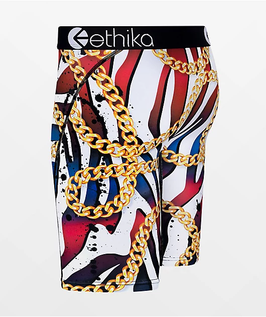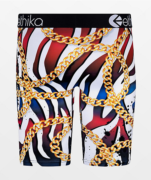 The kids Glory Be Glass Tiger boxer briefs from Ethika bring style and function. Sublimated red and blue animal print is paired with gold chain detailing throughout, bringing bold flair to any wardrobe. Made from a stretchy and breathable polyester blend,
