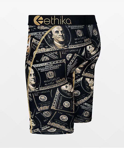 From Ethika Underwear comes the kids Gold Barz boxer briefs, featuring sublimated graphics of gold 100 dollar bills printed throughout, and gold logo script at the waistband.