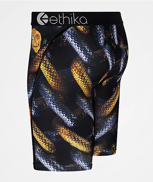The Gold Venom Ethika kids boxer briefs have a black colorway, with sublimated hissing snakes graphics throughout. Designed to never gather or chafe, these Ethika boxers will surely become a staple, and with their breathable, stretchy poly-spandex blend,
