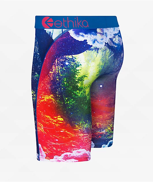 The kids Jungle Dreams boxer briefs from Ethika come in a blue colorway with a sublimated graphic throughout of a tiger in the forest. These elastic boxer briefs have a lightweight, breathable construction with flatlock-stitched seams and no-rise technolo