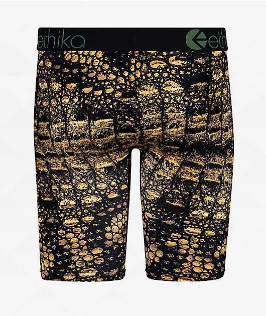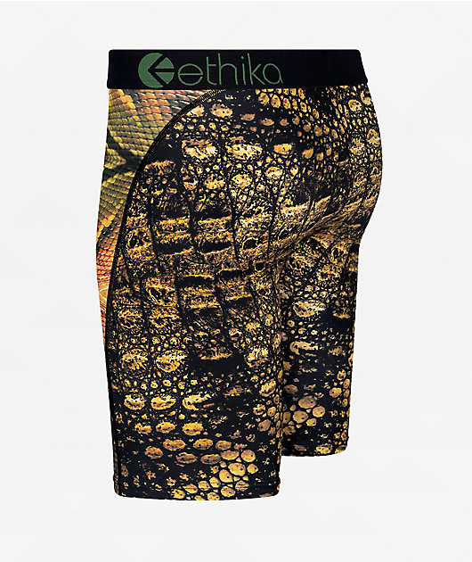 These Kids Reptillian boxer briefs from Ethika feature an allover snake skin print throughout, with orange and yellow tones. The youth boxers are made from stretchy moisture-wicking material, and are complete with flat-lock stitched seams, a thick elastic
