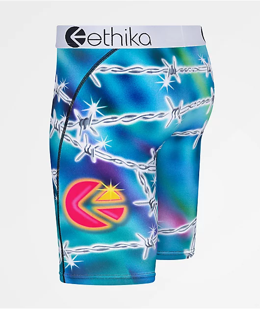 The kids Scorpion Ethika boxer briefs feature a snug, white waistband boasting the brand name as well as sublimated imagery throughout of chain links and a scorpion over a blue and purple tie dye. This underwear has a lightweight, breathable construction
