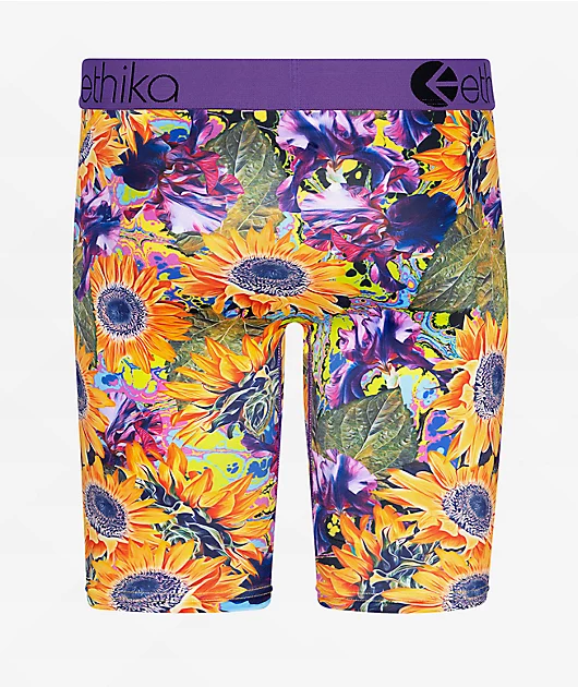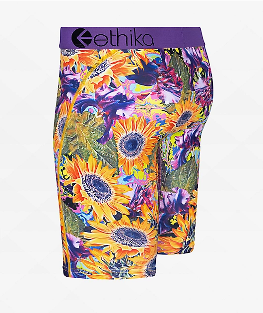 The kids Sunny Daze boxer briefs from Ethika feature a purple elastic waistband with sublimated surreal flower graphics throughout. For all day comfort, this underwear has a lightweight and breathable construction