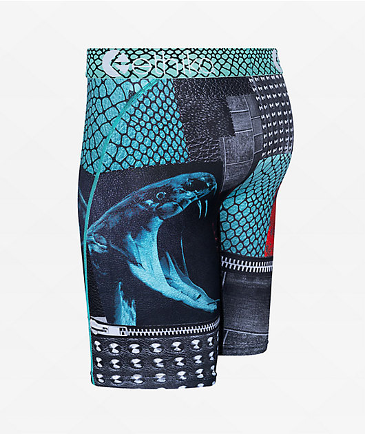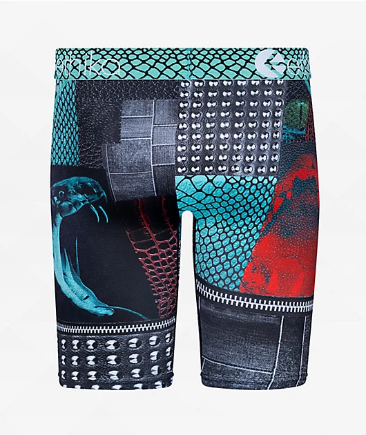 The kids Venomous boxer briefs from Ethika feature a teal and black snakeskin pattern along the elastic waistband as well as sublimated snake graphics throughout. This underwear is perfect for all day wear with no-rise technology and flatlock seams.