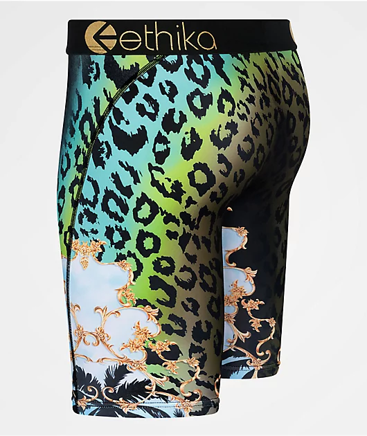 The King West boxer briefs from Ethika feature sublimated graphics of multicolored cheetah print throughout, and palm trees at the leg opening with gold trim between the graphics.