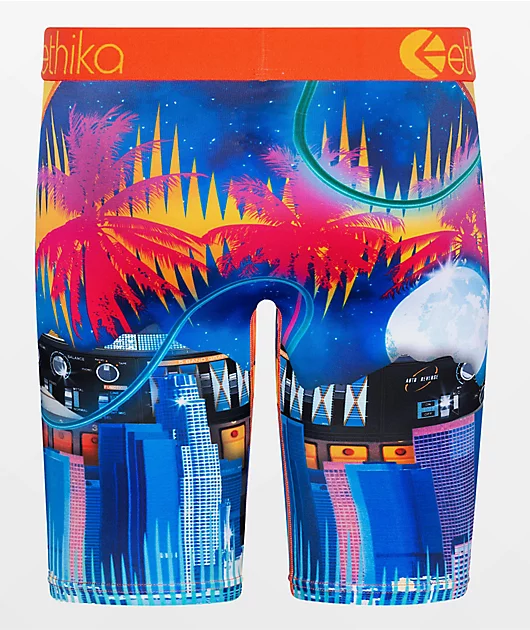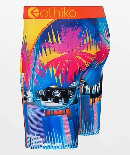 The LA Beats Ethika boxer briefs have a colorful sublimated graphic of a city skyline, a boombox, and tree outlines. Made from a premium poly-spandex blend, these underwear are designed to move comfortably with you, and with the no-rise technology, these