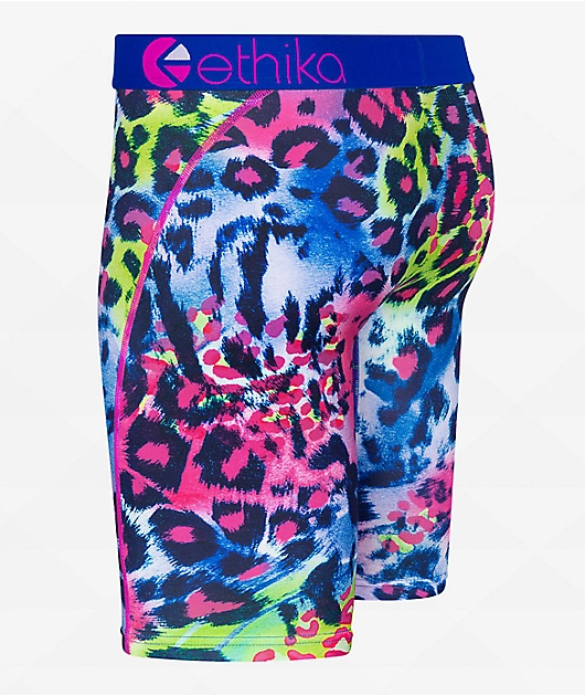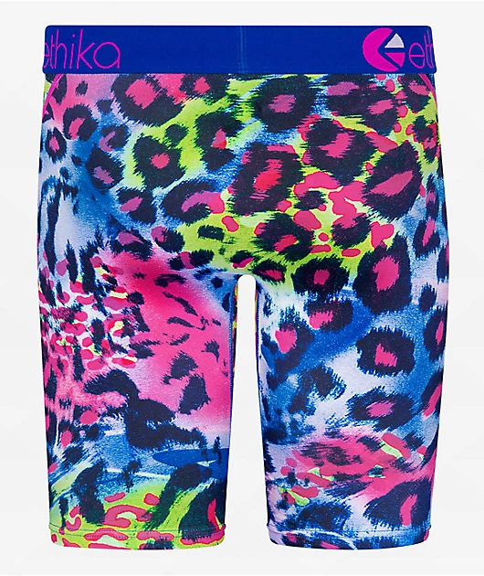 The kids Leopardy boxers from Ethika come in a blue and pink colorway and feature a vibrant, multi-colored leopard print design throughout. Made from a stretchy polyester blend, the kids Ethika boxers feature flat-lock stitched seams throughout for irrita