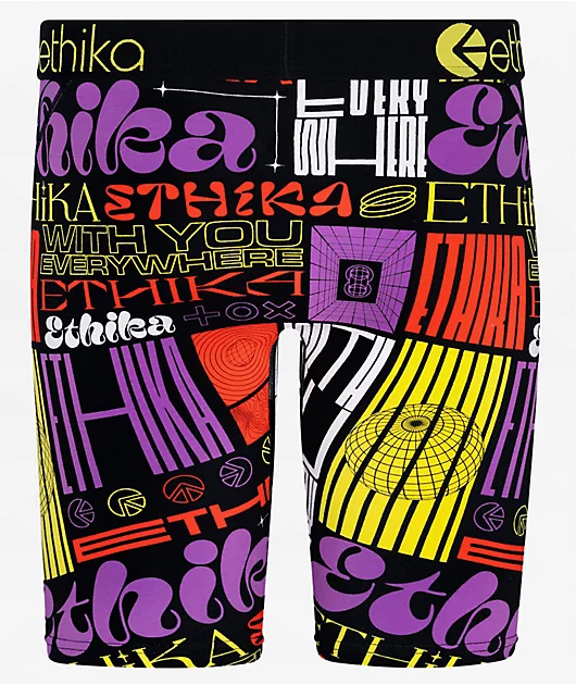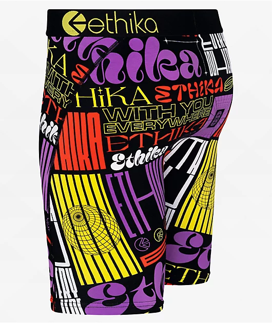 The My Type boxer briefs from Ethika feature a black elastic waistband and sublimated brand script in various fonts and colors for a whimsical look. These boxer briefs have a lightweight, breathable construction, made of 100% reactive cotton, with flatloc