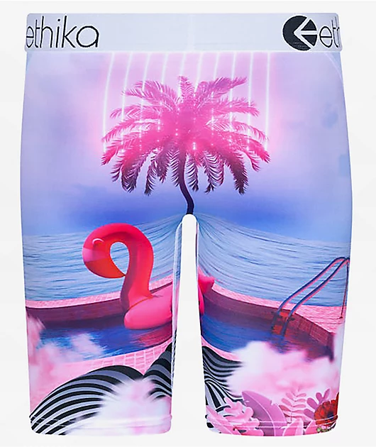 The Ethika On Holiday boxer briefs provide ample mobility and breathability with its poly-spandex blend, and the flatlock-stitched seams offer an anti-itch fit. The briefs also feature sublimated graphics of pink flamingos, palm trees, and a moon, while a