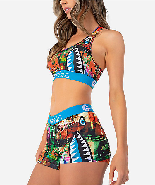 The Rated E Staple Boyshorts from Ethika come in a blue colorway with a green and orange all over print. Made from a stretchy cotton blend, the low-rise boyshorts feature Ethika’s signature Bomber shark design on the left leg. The Ethika boyshorts are com