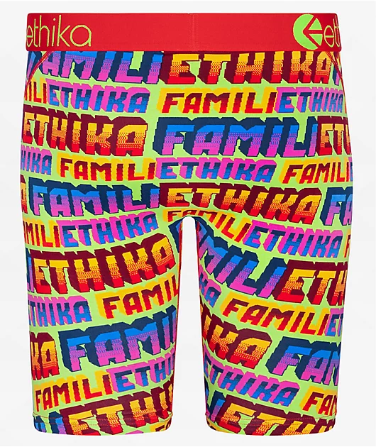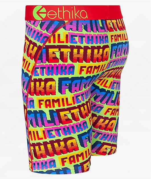 From Ethika, the Retro Flow boxer briefs come in a light green and red colorway, with a colorful allover print reading \”Ethika | Famili.\” Made from a stretchy cotton-spandex blend, the breathable Ethika boxers are finished with flat-lock stitched seams,