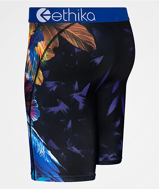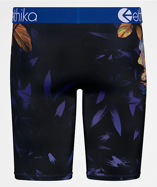 From Ethika come the Typhoon Heat boxer briefs, featuring a thick blue non-itch waistband with Jacquard knit Ethika branding on the front. With a sublimated design of a tiger and parrot surrounded by various flowers, the stretchy and smooth polyester blen