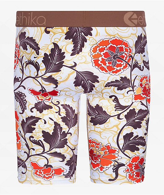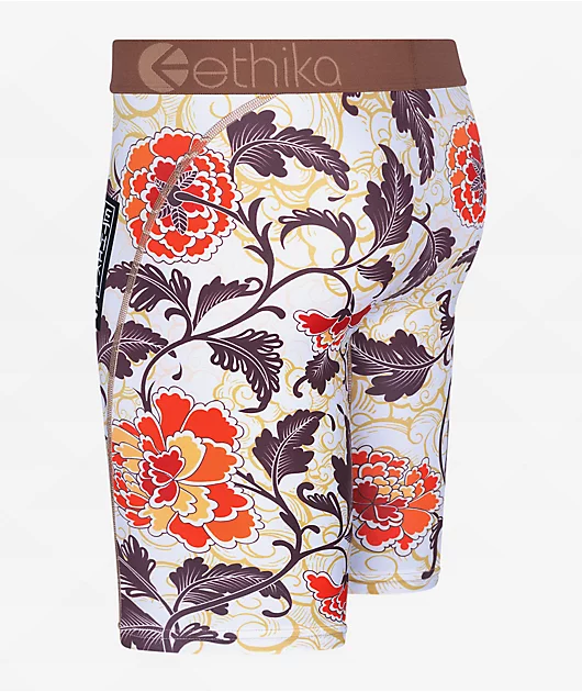 The Wind Floral boxer briefs from Ethika features a brown elastic waistband and stitching with sublimated floral graphics throughout over a white background. This maximalist underwear has a lightweight, breathable construction with no-rise technology for