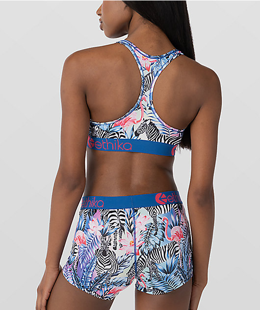 Zebras, flamingos, and lush flowers. Ethika is back at it again with the Zebra Paradise blue boyshort underwear! These underwear come with colorful graphics of Zebras, flamingos, blue foliage, tropical flowers, and a dreamy blue and pink background to com
