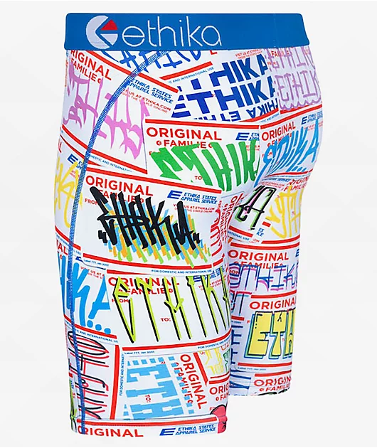 The City Slappin’ boxer briefs from Ethika feature a blue elastic waistband boasting brand script while sublimated name tags throughout the legs display various graffiti brand script. For comfortable, all day wear, these boxer briefs have a breathable, ta