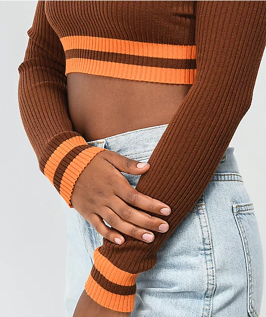 Add an autumn-ready touch to your ensembles with the brown and orange crop sweater from Ethos! With a soft, stretchy construction and long-sleeved silhouette, this top keeps things cozy, while the cropped hemline adds a little interest to the mix. The bro