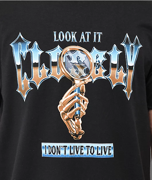 In a solid black colorway from Foos Gone Wild comes the Look At It Closely t-shirt, showing screen-printed script across the chest that reads \”Look at it closely | I don’t live to live\” with the image of a skeletal hand holding up a magnifying glass that
