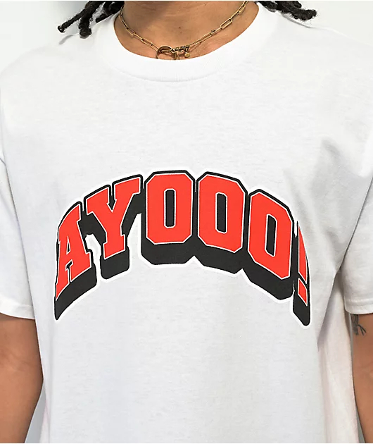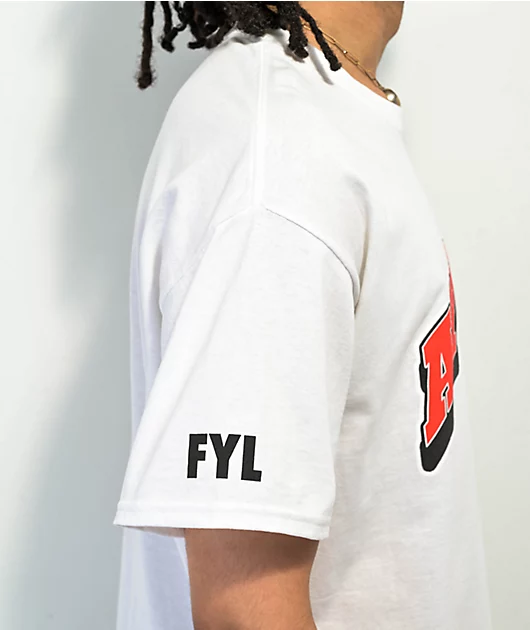 The AYOOO t-shirt from FYL NYC comes in a white colorway, with red arched lettering across the chest. Made from 100% cotton, the FYL tee is complete with a ribbed collar and a a printed neckline.