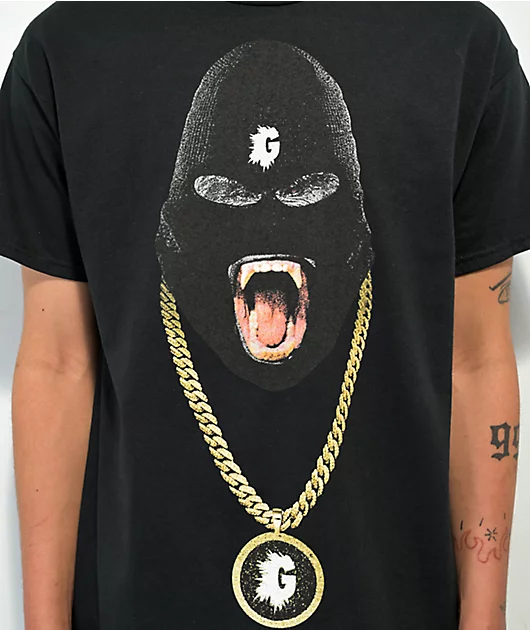 The FYL NYC Bing Kong t-shirt comes in a black colorway, made from premium midweight cotton. An image of a gorilla wearing a ski mask appears on the chest, with a flooded gold chain graphic below.