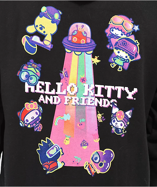 The Kawaii Arcade Friends hoodie from Girl x Sanrio is made of 100% cotton and comes in a black colorway with a back graphic of Hello Kitty and her friends for a whimsical look.