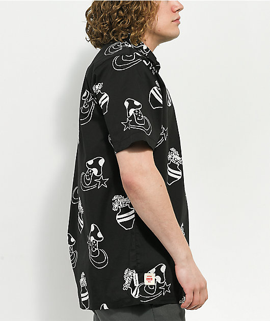 The Underground Holiday short sleeve shirt from Globe comes in a black colorway with an all over print pattern of mushrooms and vases in white for contrast. This Globe shirt has a button-up closure, turndown collar, and a straight bottom hem and made of l