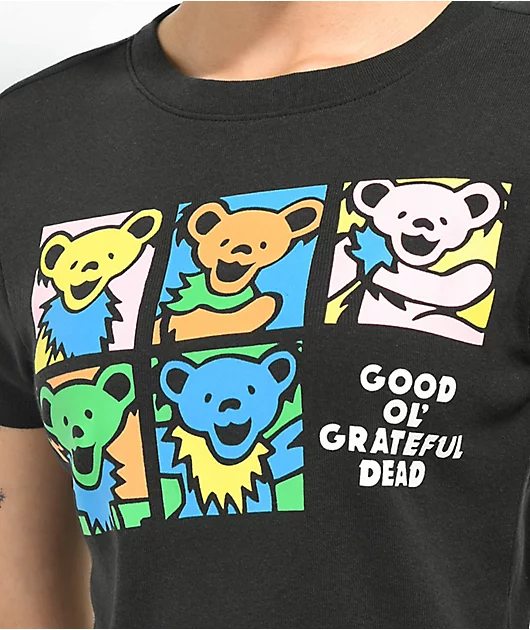 The Grateful Dead Bears crop top comes in a black colorway. Featuring a screen-printed graphic of colorful bears on the front chest that gives off a vintage art vibe, with the words, \”Good ol’ grateful dead\”, to the left. A 100% cotton construction, along
