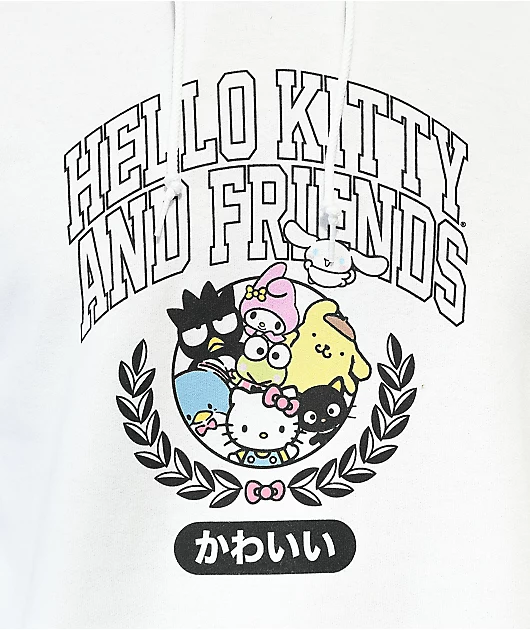 The Collegiate Hoodie from Hello Kitty And Friends By Sanrio comes in a white colorway with a screen-printed graphic on the front of varsity font reading, \”Hello Kitty And Friends\” and multiple Sanrio characters within a collegiate crest. This hoodie is m