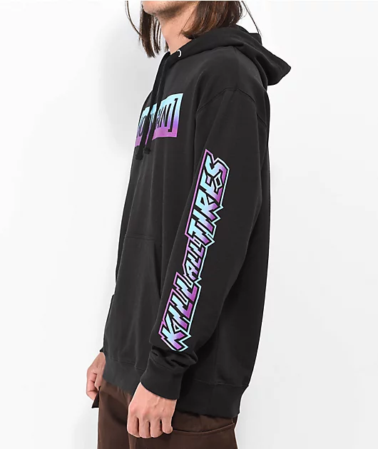 From Ken Block’s Hoonigan comes the Censor Bar Kill All Tires hoodie in a black colorway, with blue and purple faded graphics. A Hoonigan logo is centered on the chest, while screen-printed retro lettering, which reads \”Kill all tires\” can be seen along b