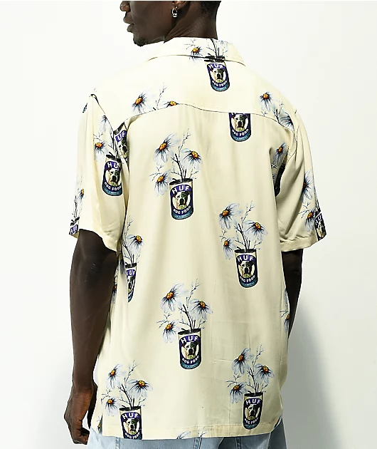 HUF brings the Canned off-white resort shirt. This soft, thin-knit shirt is constructed from flowy rayon, keeping it comfortable in warm, balmy weather, while its fold-over collar and button-up placket lend it a laid-back touch. All over print images of d