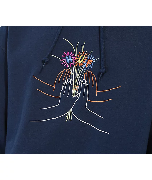 Featuring colorful embroidery on the chest, the navy blue Community Garden hoodie from HUF is made from a soft heavyweight cotton blend. Imagery of two sets of hands near a bouquet of flowers brings a conscious message to the hoodie, as the hoodie is fini