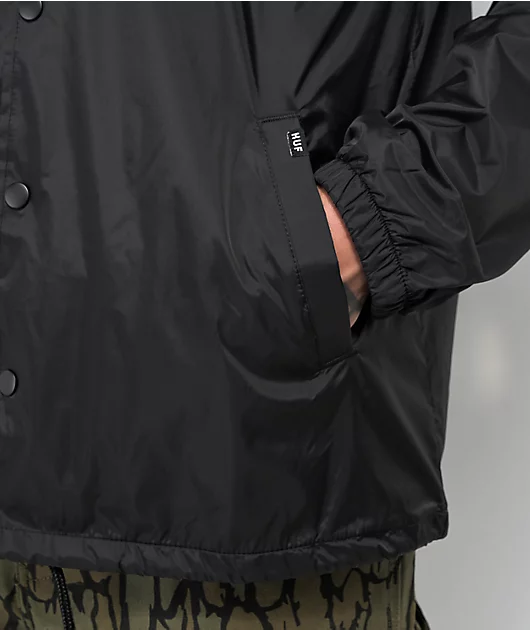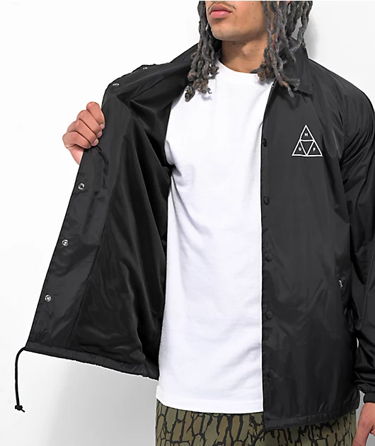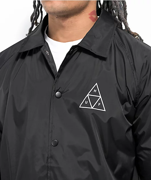 From HUF comes the Essentials Triple Triangle coaches jacket, in a black colorway. With a full snap closure, the he water and wind-resistant design features a classic white HUF branding printed on the left chest and back, while a turn down collar maintain
