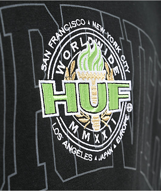 From HUF comes the Forever Torch crewneck sweatshirt in a black colorway, displaying the embroidered image of a HUF designed Olympic sigil. This crewneck is made from a soft and durable cotton-poly blend, offering a classic look with a ribbed collar, slee