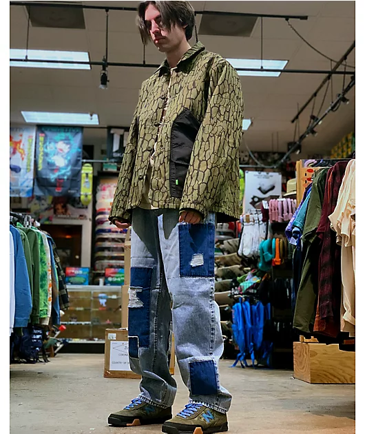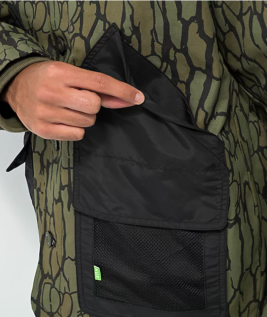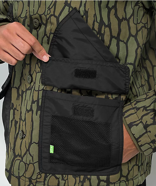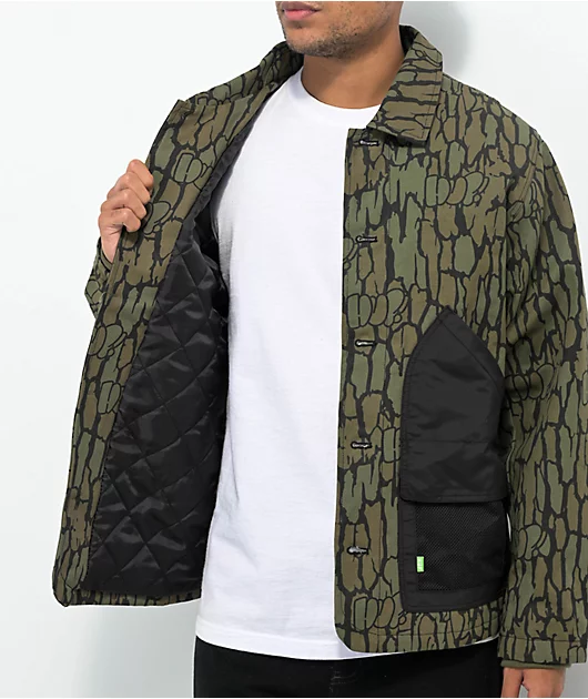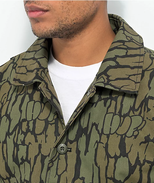 The Hudson work jacket from HUF comes in a black and green camo colorway with sublimated brand script throughout. Made with a 100% cotton shell and 100% lining, this comfortable jacket features full button up closure and pockets on each hip with two slash