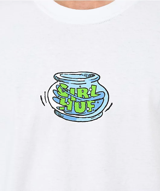 From the HUF x Girl collaboration comes the Fish Bowl t-shirt in a light blue colorway, with a screen-printed image of a fish bowl with green branding on the chest. With a green fish and blue text on the back, the breathable cotton t-shirt is finished wit