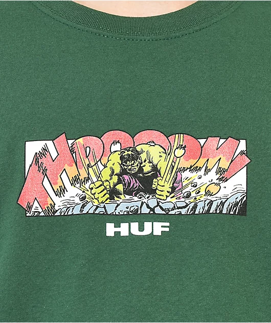 The Rage shirt from the HUF and Hulk collab has a short sleeve silhouette, a crewneck collar, and a soft, durable, midweight cotton fabrication. This Marvel t-shirt is featured in a forest green colorway with a screen-printed comic book graphic across the