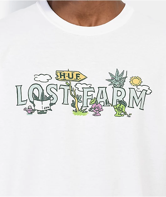 HUF collaborates with Lost Farm to infuse cannabis-influenced graphics on this white t-shirt. Coming in a slightly relaxed fit, illustrated characters appear along with green brand text on the chest; as the breathable midweight cotton tee is finished with