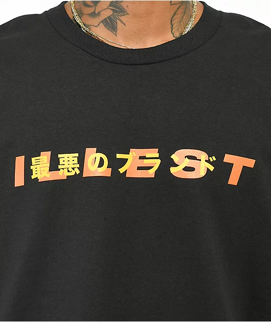 The World Famous t-shirt from Illest comes in a black colorway and features stylish orange branding script below yellow Japanese lettering on the chest. A larger screen-printed graphic appears on the back, with a modern JDM car with GT roots, along with r