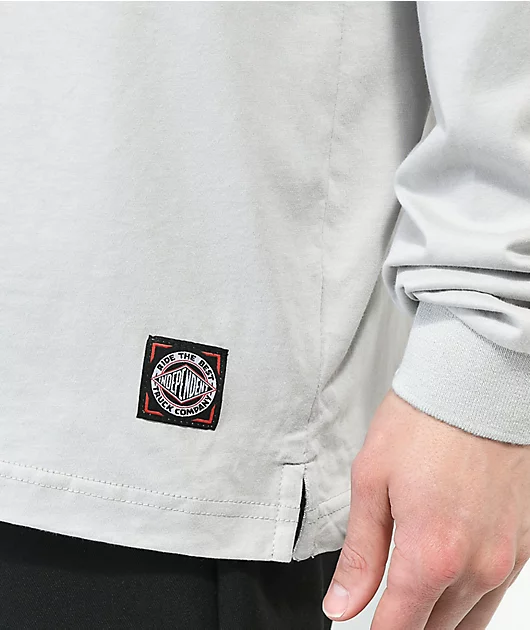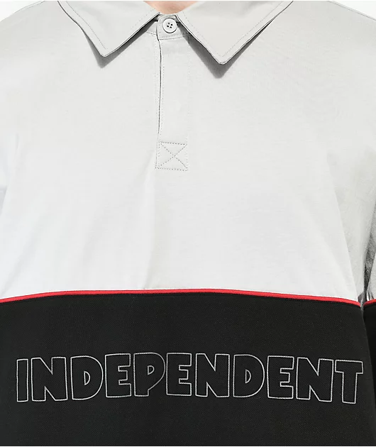 The Independent ITC Streak rugby shirt comes in a grey colorway. The split hemline construction features a black horizontal stripe with red piping running throughout the chest, with screen-printed Independent text on the front. The rugby shirt is construc