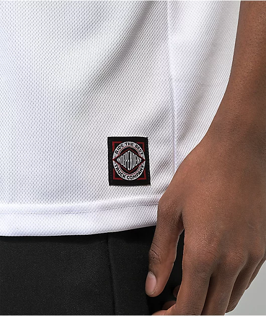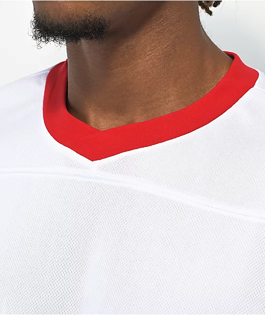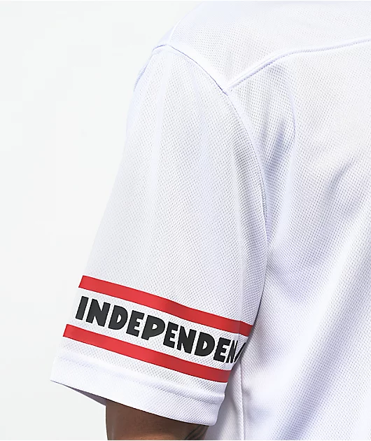 The ITC Streak Independent jersey has a breathable, lightweight mesh construction, and comes in a white colorway and short sleeve silhouette. The V-neckline has a contrasting red colorway, and both sleeves bear wraparound screen-printed Independent script